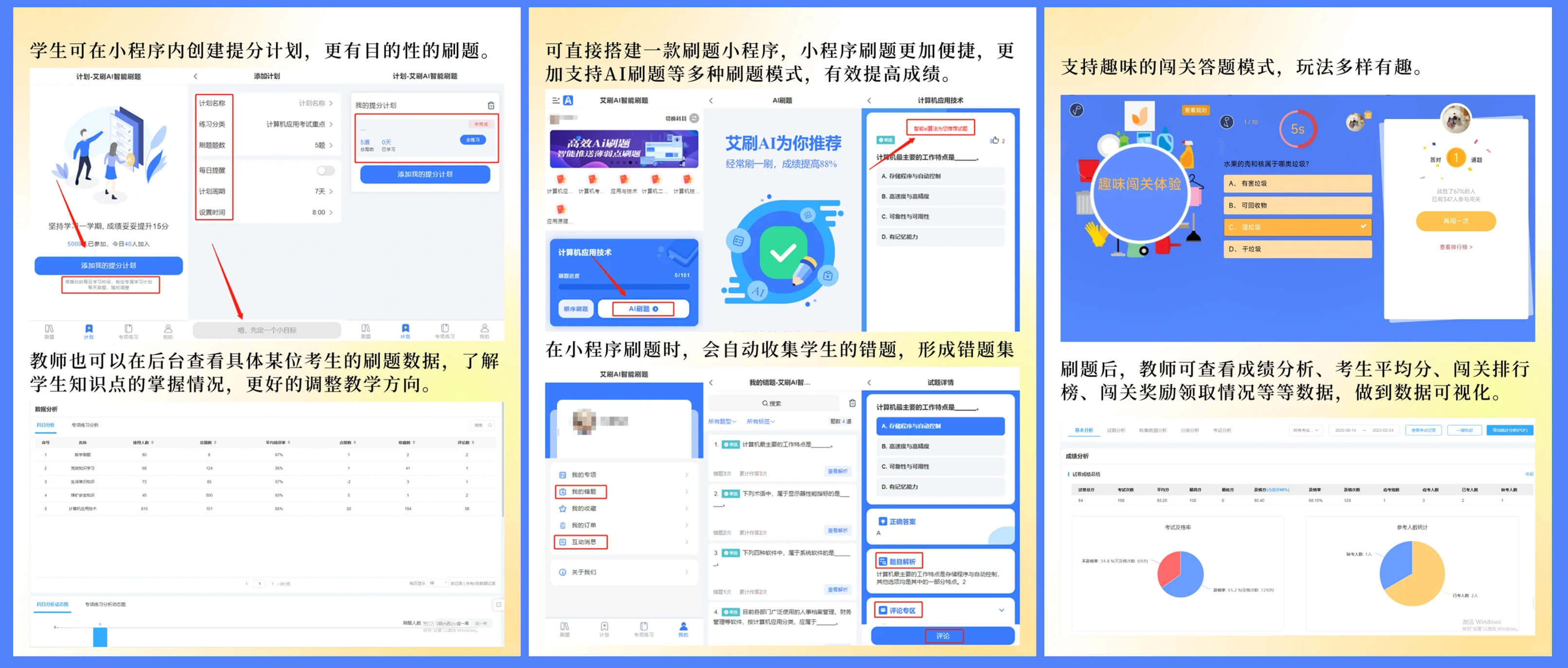 小火科技决定开发一款名为“智慧答题”的在线教育小程序,该小程序旨在为学生提供一个便捷有效的学习工具。该小程序通过提供丰富多样的题库、智能批改功能以及学习记录和报告,帮助学生在学习过程中提高学习效率,巩固知识点。同时,家长通过该小程序可以得到有价值的帮助,了解孩子的学习状况,及时发现问题,促进家校合作。
