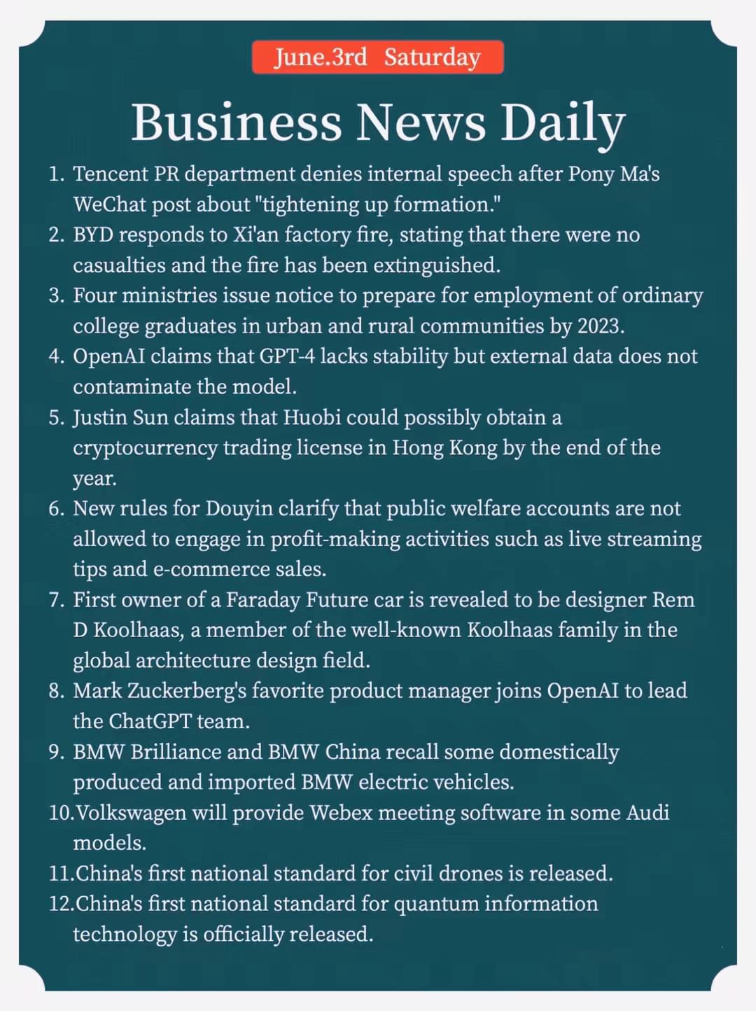 1.Tencent PR department denies internal speech after Pony Ma's WeChat post about "tightening up formation."