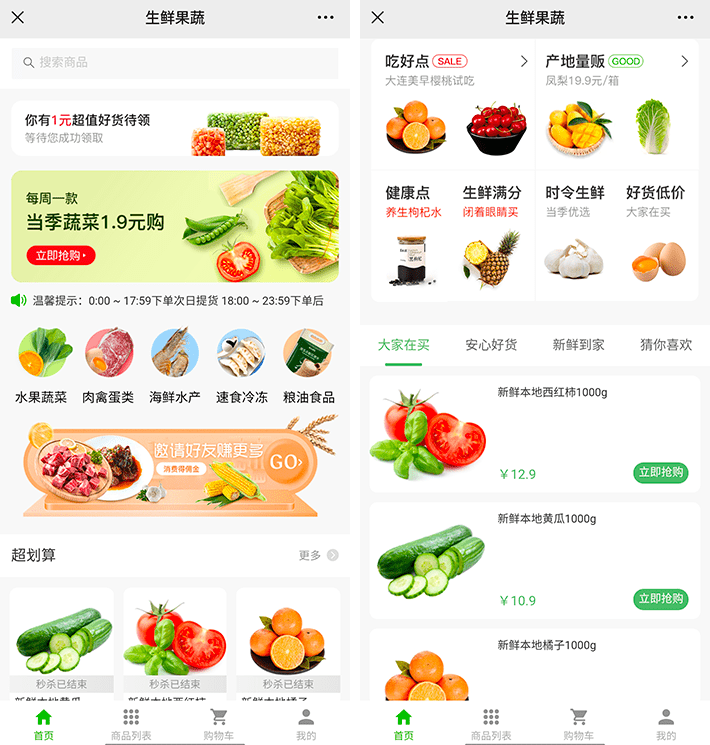 1. 商品展示和搜索:展示生鲜食品的照片,价格和详细信息,并提供搜索引擎方便用户查找所需产品。