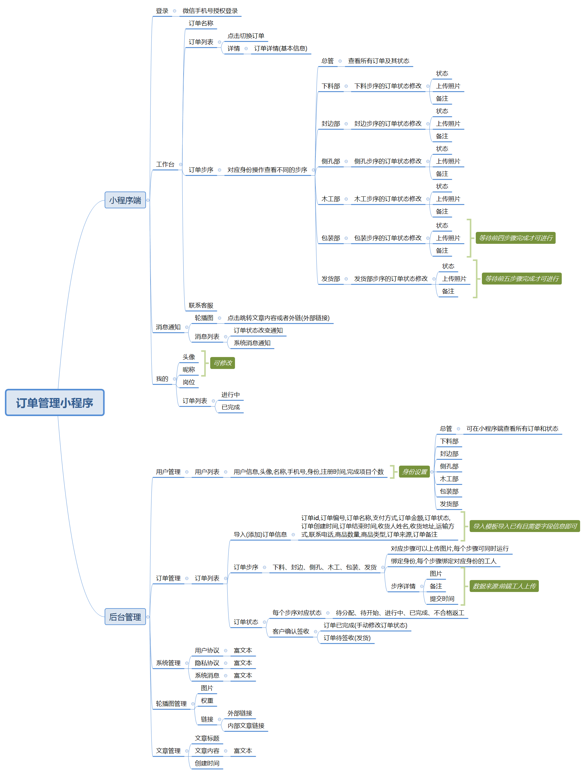 我们结合上面的思维导图来看,该小程序通过导入客户订单,同步到每个工种的手机端,同时按照订单的制作步骤:下料、封边、侧孔、木工、包装、发货的先后步骤,一个工种完成工作后,拍照上传,同时标注状态和备注。同时,每个工种都有5种状态,包括:待分配、待开始、进行中、已完成、不合格返工。大家都可以在手机小程序上,看到当前物料的状态,也在很大程度上提升了公司的管理监督能力。
