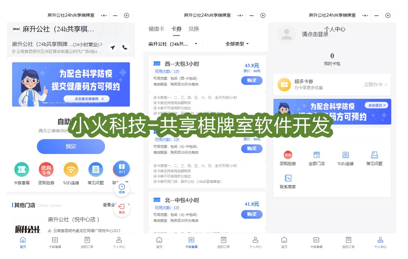 下面是ng体育公司的一套24小时共享棋牌室小程序案例。软件对接硬件之后,可以实现开门、离店、订单开始电源自动开启等功能。同时用户在软件上可以选择卡券套餐、续单、团购验券、WIFI连接、联系商家。