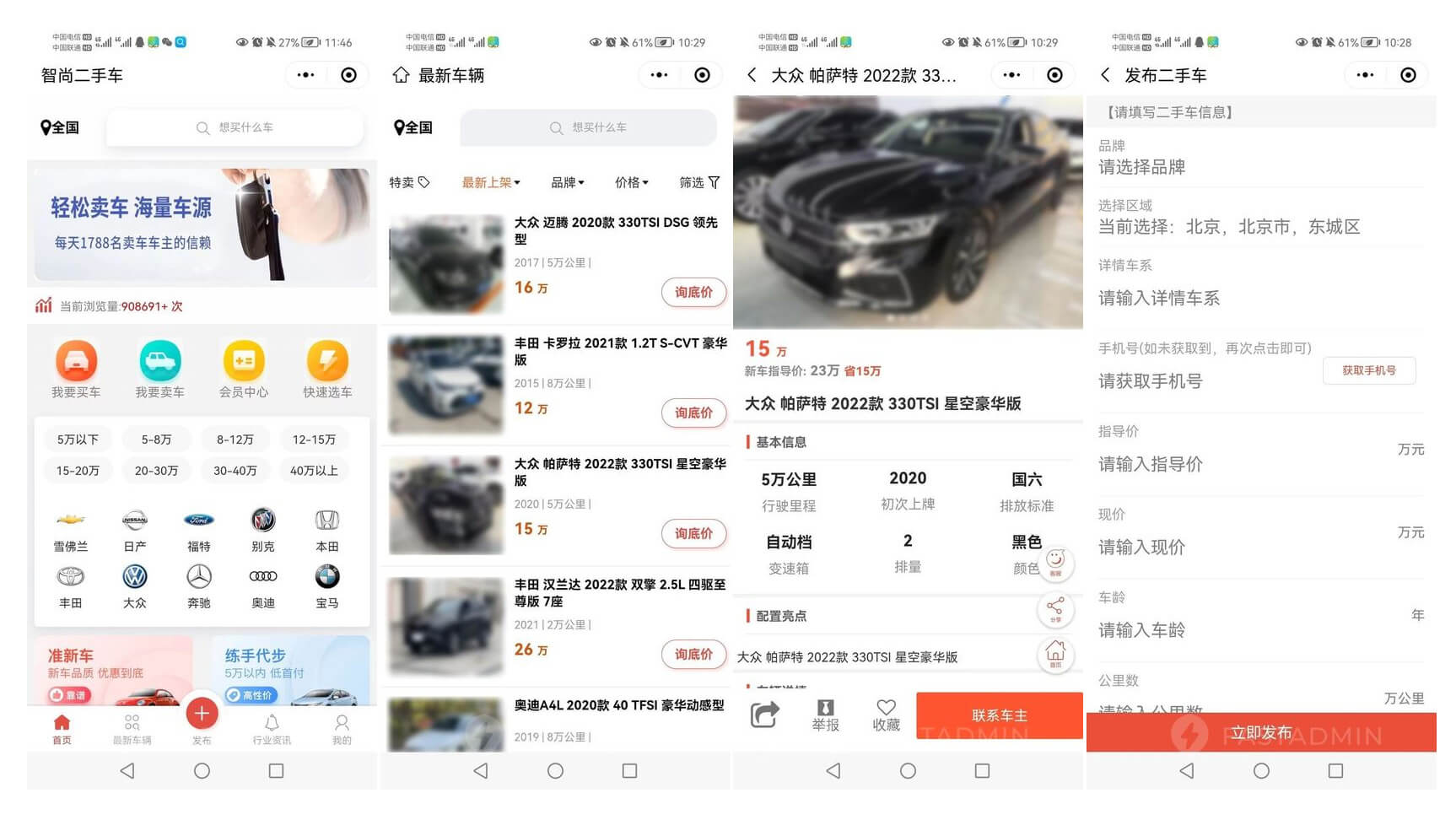 4. 车源发布:用户可一键发布二手车,平台审核上线,支持发布可编辑、删除等操作。