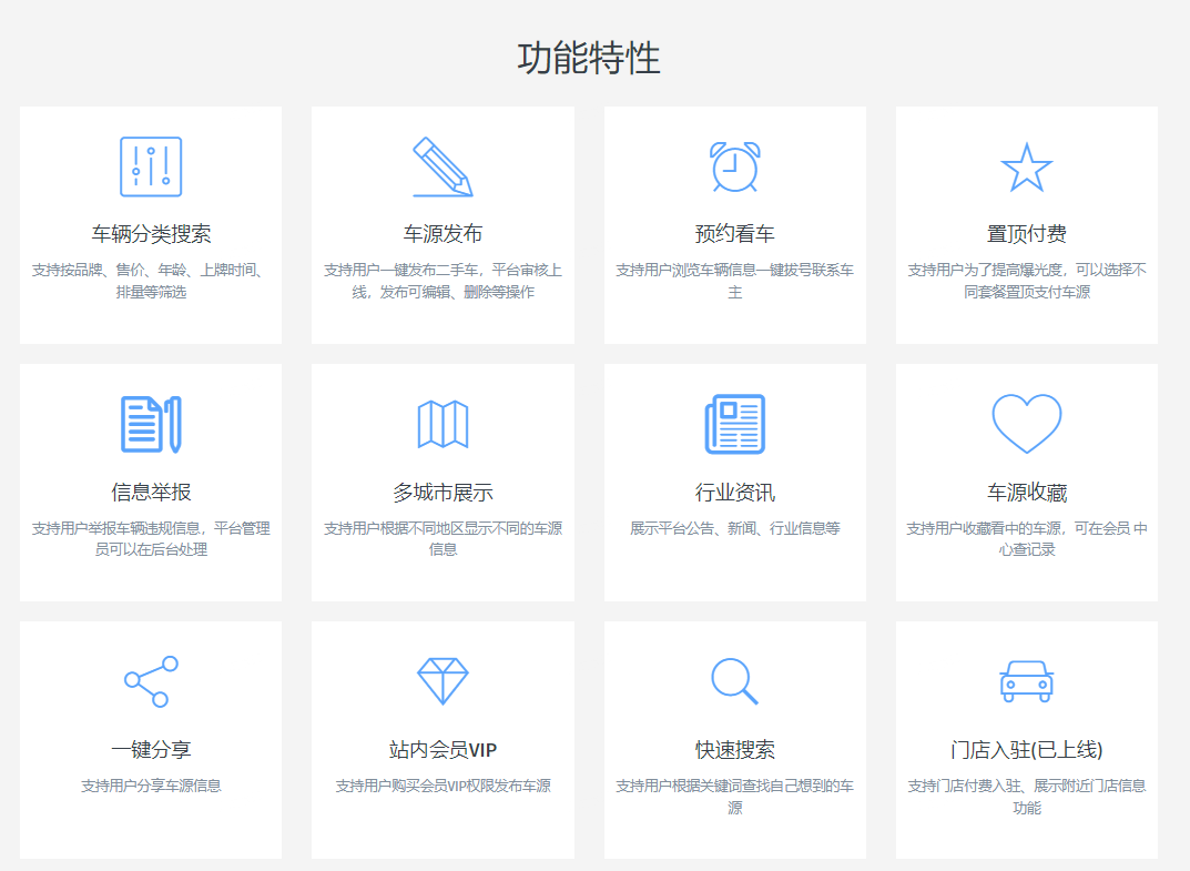 11. 车源收藏:支持用户收藏看中的车源,可在会员中心查看记录。