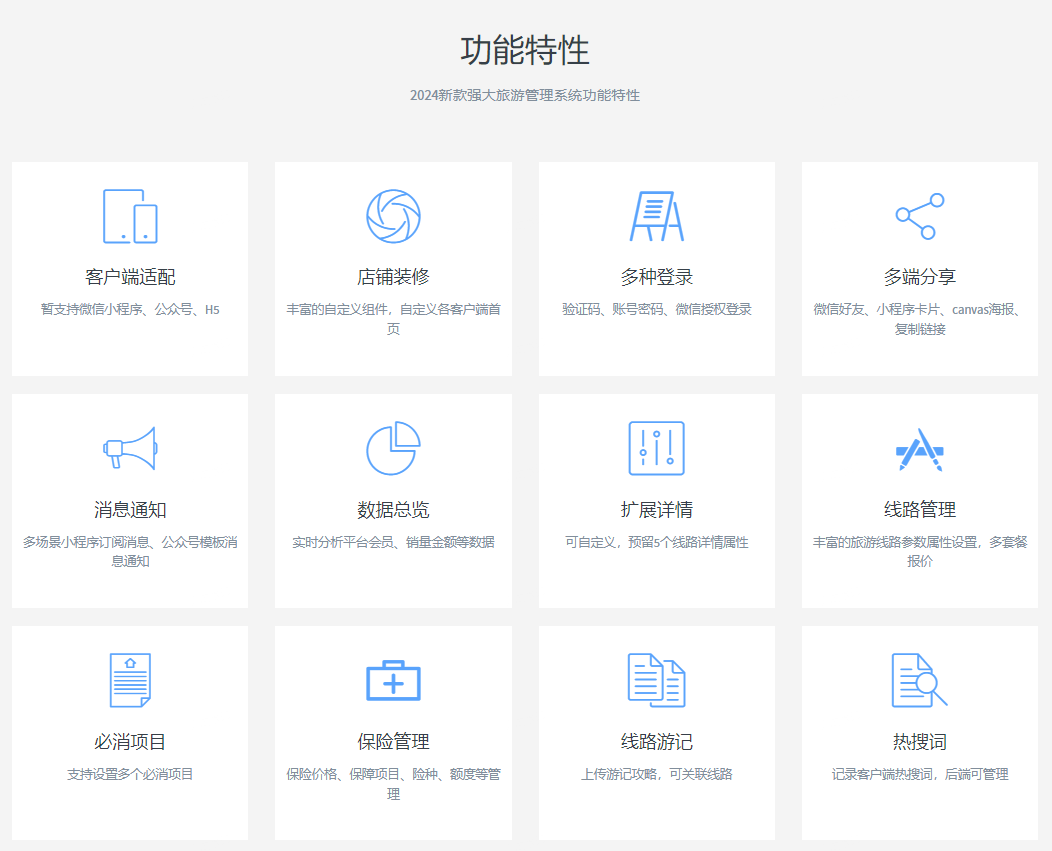 通过以上丰富多样的功能特性,这套旅游管理系统能够满足旅游业务提供商在产品管理、市场营销、用户服务等多方面的需求,帮助其在竞争激烈的旅游市场中脱颖而出。同时,这套系统还具有强大的扩展性和易用性,能够随着业务的发展和市场需求进行快速调整,助力旅游行业企业实现可持续发展。